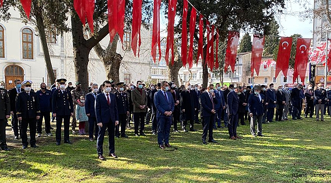 Deniz Şehitliği'nde düzenlenen ilk tören, şehitliğe çelenklerin konulması, saygı duruşu, İstiklal Marşı'nın okunması ve saygı duruşuyla başladı. Daha sonra günün anlam ve önemini belirten konuşmayı Şehit ve Gazi aileleri Derneği Başkanı Mehmet Özgen yaptı. Özgen’in açıklamalarının ardından Vali Erol Karaömeroğlu, Şehitlik Defteri'ni imzaladı. Şehitlik defterini imzalayan Vali Karaömeroğlu; "Bugün Çanakkale Zaferimizin 106. Yıldönümünü, millet olarak büyük bir gurur ve heyecanla idrak ediyoruz. Çanakkale’de sergilenen birlik, kardeşlik ve dayanışma milletimize hem zaferi getirmiş, hem de Kurtuluş Savaşımız için gerekli olan cesareti ve mücadele ruhunu vermiştir. Çanakkale Zaferi, vatanı, dini, hürriyeti ve istikbali söz konusu olduğunda Türk Milleti’nin neleri göze alabileceğini, neleri başarabileceğini tüm dünyaya göstermiştir. Ülkemizin bekası için seve seve canlarını feda eden, ulusumuzun tarihin her sayfasında onurla yer almasını sağlayan, kanlarıyla üzerinde yaşadığımız toprakları vatan yapan, bağımsızlığımızın timsali bayrağımızı bizlere armağan eden, Türkiye Cumhuriyeti’nin sonsuza kadar sürecek varlığının manevi simgesi olan aziz şehitlerimizin huzuruna en derin saygılarımızı, en derin hürmetlerimizi ve minnet duygularımızı arz etmeye geldik. Bizlere miras bıraktığınız Anadolu topraklarının her karışı için canınızı feda etmekten, mübarek kanlarınızı büyük Türk Milleti’nin istiklali ve istikbali için akıtmaktan bir an bile geri durmadığınızı milletçe çok iyi biliyoruz. Sizler de biliniz ki; milletçe bıraktığınız her emanete sahip çıkıyor, sizin şehadet sebeplerinizi aynı ruhla, aynı heyecanla yaşatıyoruz. Türkiye Cumhuriyeti Devleti’nin ilelebet payidar olması için bu yüce milletin her ferdi olarak üzerimize düşeni yapmaktan bugüne kadar bir an bile tereddüt etmedik bundan sonrada etmeyeceğiz.
