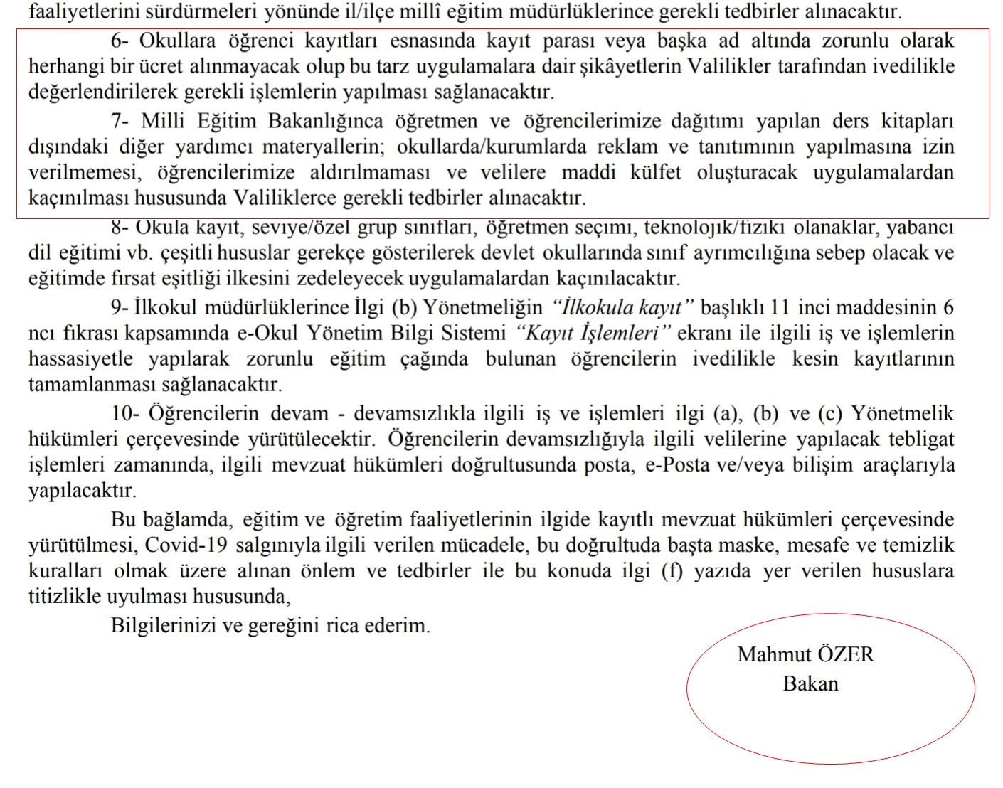 Madde 7: Milli Eğitim Bakanlığınca öğretmen ve öğrencilerimize dağıtımı yapılan ders kitapları dışındaki diğer yardımcı materyallerin; okullarda/kurumlarda reklam ve tanıtımının yapılmasına izin verilmemesi, öğrencilerimize aldırılmaması ve velilere maddi külfet oluşturacak uygulamalardan kaçınılması hususunda Valiliklerce gerekli tedbirler alınacaktır.