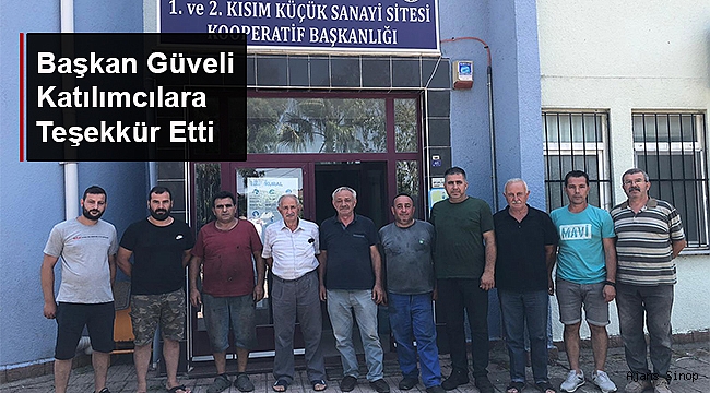 Sinop’ta 29 Temmuz 2021 tarihinde Sınırlı Sorumlu 1. Kısım Küçük Sanayi Sitesi Yapı Kooperatifi Genel Kurulu gerçekleşmiş ve mevcut başkan bayram güveli yeniden başkan seçilmişti. Gerçekleşen genel kurulun ardından güven tazeleyen Başkan Bayram Güveli ve yönetim kurulu üyeleri Ferhat Balcı, Zeki Akyıldız, Seyit Mehmet Altıkulaç, Ali Konukçu, Hüseyin Tütüncü, İsmail Gayret, Selçuk Bafralı, Hüseyin Niyazi Sağır, Serim Ekmekçioğlu kongreye katılan katılımcılara teşekkür etti.