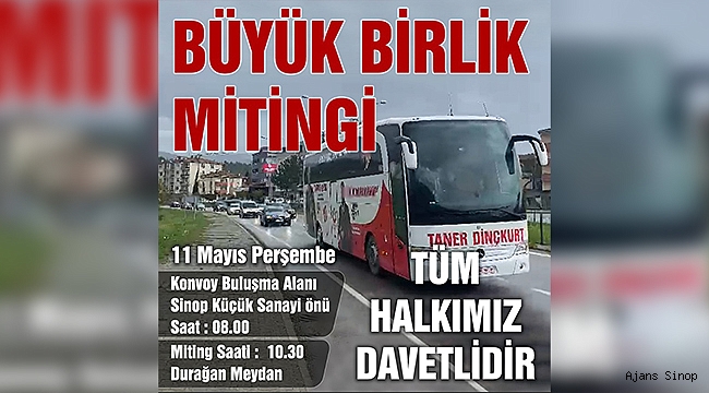 14 Mayıs Cumhurbaşkanlığı ve Milletvekili seçimlerine sayılı günler kala Büyük Birlik Partisi Sinop Milletvekili Adayı Taner Dinçkurt ‘Büyük Birlik Mitingi’ düzenleyeceğini duyurdu.Tüm hemşehrilerini mitinde davet eden Dinçkurt; “Tüm halkımızı mitingimize davet ediyorum. Sinop bizim sevdamız. Sinoplu’lar bizim sevdamız. Büyük Birliği hep birlikte oluşturacağız. Hemşehrilerimizin ilgili büyük. Artık değişim istiyorlar. Yıllardır kentin kangren haline gelen yaralarını Büyük Birlik hareketimizle saracağız. Bu anlamda 11 Mayıs Perşembe günü saat 10:30’da Sinop’a ve Sinoplu’ya gönül veren tüm hemşehrilerimi Durağan Meydanı’ndaki mitingimize davet ediyorum. Katılımları bizleri onurlandıracaktır.” İfadelerine yer verdi.