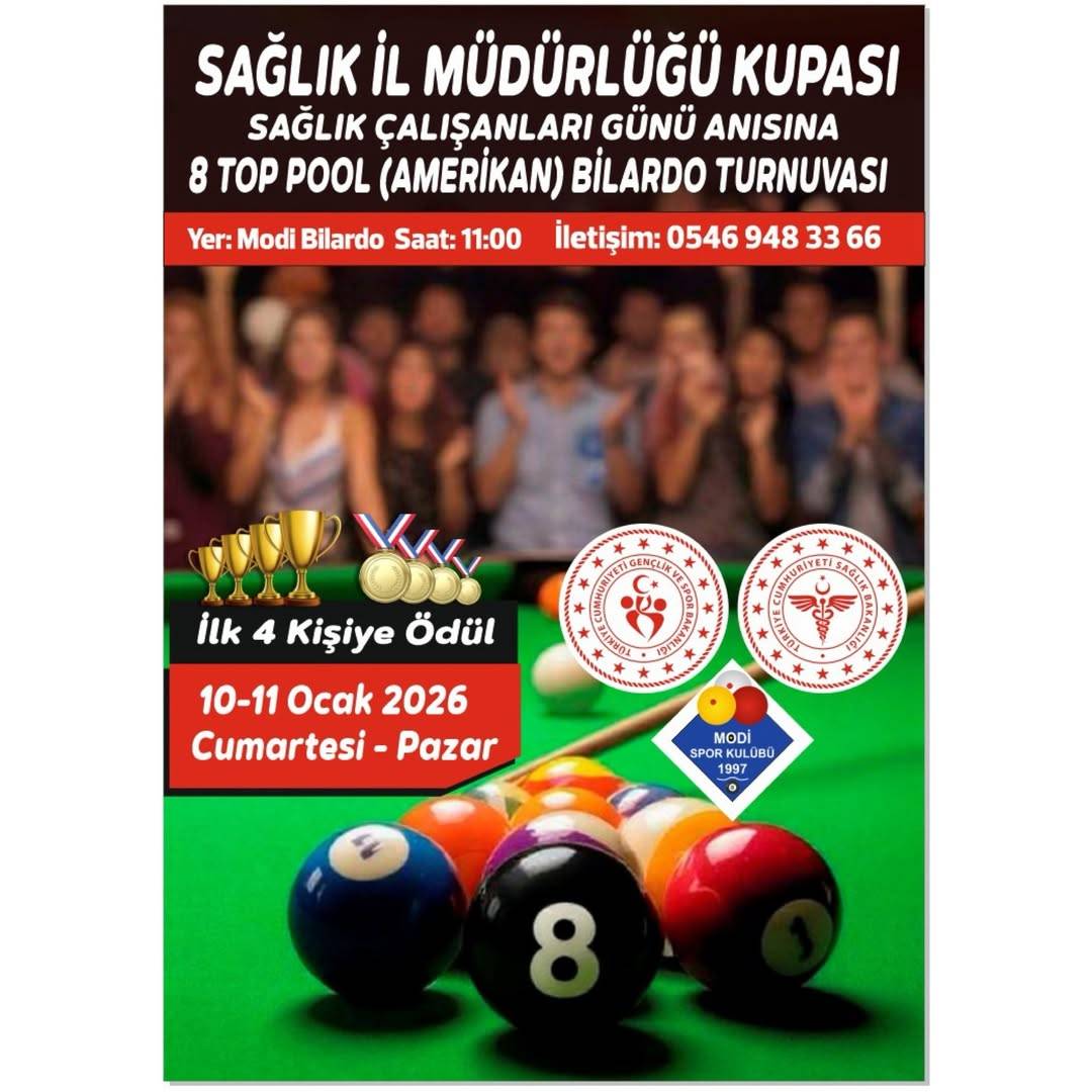 2026 yılı Gençlik ve Spor İl Müdürlüğü faaliyet programı kapsamında, Sağlık Çalışanları Günü’ne özel olarak “Sağlık İl Müdürlüğü Kupası – 8 Top (Amerikan) Bilardo Turnuvası” düzenlenecek.Turnuva, 10–11 Ocak 2026 tarihlerinde Sinop’taki Modi Bilardo’da gerçekleştirilecek. Organizasyona tüm sağlık personeli davetli olup, katılım ücretsiz olacak. Ancak kontenjan 32 kişi ile sınırlı bulunuyor.Turnuvaya katılmak isteyen personel, bağlı bulundukları birim sorumluları aracılığıyla isimlerini iletebilecek. Etkinlik, saat 11.00’de başlayacak. Turnuvada ilk 4 sırayı alan sporculara kupa ve madalya verilecek.
