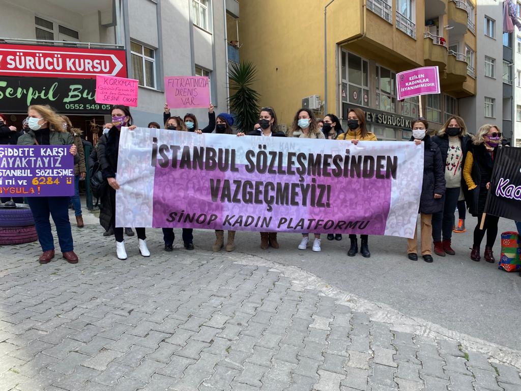 Sinop Eğitim Sen Binası önünde gerçekleşen basın açıklamasında Sinop Kadın Platformu adına konuşan Canan Ergün; ““Kadına Yönelik Şiddet ve Ev içi Şiddetin Önlenmesi ve Bunlarla Mücadeleye Dair Avrupa Konseyi Sözleşmesi” yani bilinen adıyla İstanbul Sözleşmesi, dün gece yarısı Cumhurbaşkanı Kararnamesi ile feshedildi.