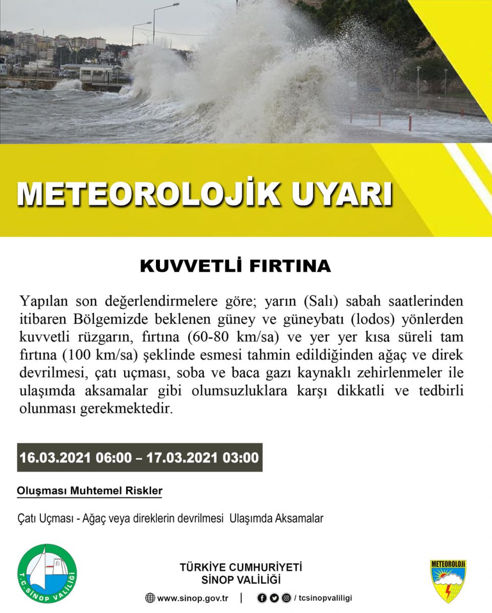 Sinop Valiliği tarafından yapılan açıklamada 16.03.2021(Salı), 17.03.2021 (Çarşamba) tarihlerinde kuvvetli rüzgarın gerçekleşeceği bildirildi.