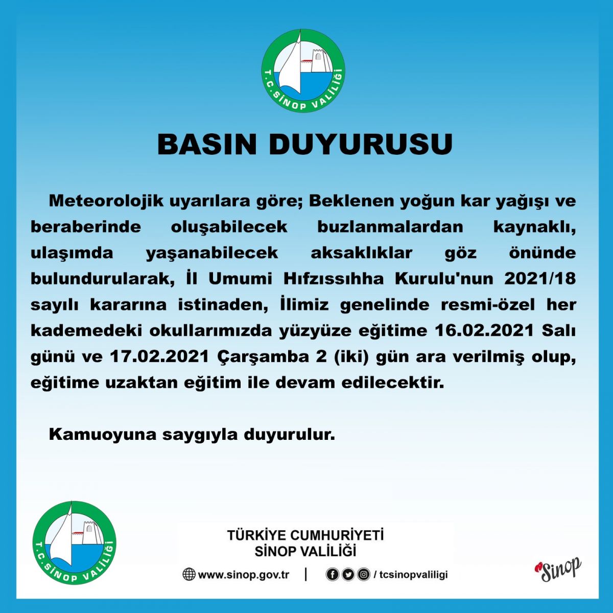 Valilikten yapılan yazılı açıklamada, il genelinde 16 Şubat Salı ve 17 Şubat Çarşamba günü yoğun kar yağışı beklendiğinden kentteki resmi ve özel tüm okullarda yüz yüze eğitime iki gün süreyle ara verildiği belirtildi.