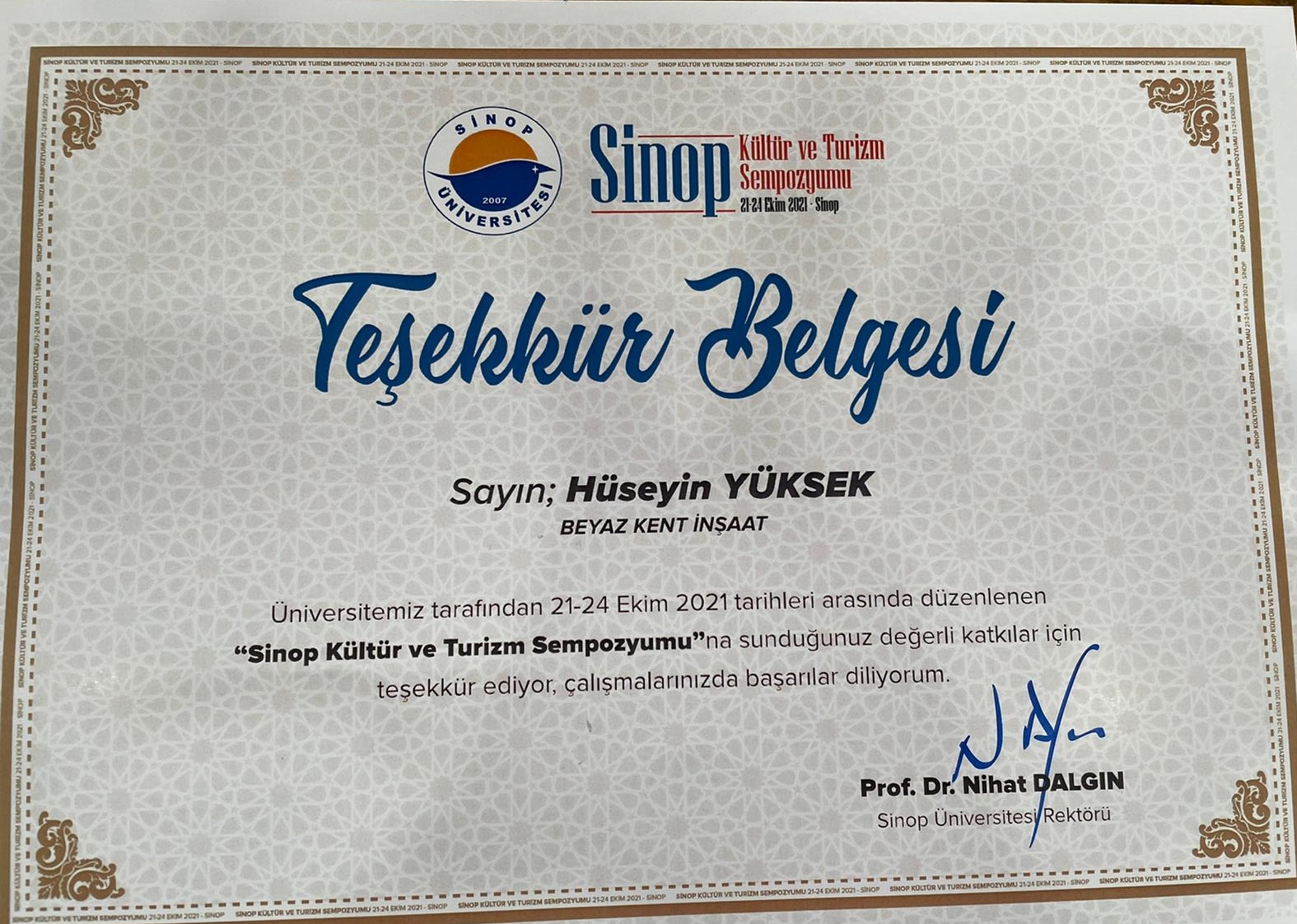 Sinop'un Gerze İlçesi başta olmak üzere kentin hemen hemen her noktasında hayırsever tutumuyla bilinen başarılı İş İnsanı Hüseyin Yüksek, 'Eğitime katkı' adı altında Sinop Üniversitesine maddi ve manevi destekte bulunmuştu. Yüksek'in bu duyarlı davranışı nedeniyle Sinop Üniversitesi tarafından teşekkür belgesi verildi. Teşekkür belgesini Sinop Üniversitesi Rektörü Prof. Dr. Nihat Dalgın adına, Gerze Meslek Yüksekokulu Müdürü Öğr. Gör. Mehmet Keskin tarafından verildi.