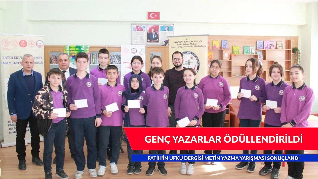 GENÇ YAZARLAR ÖDÜLLENDİRİLDİ FATİH'İN UFKU DERGİSİ METİN YAZMA YARIŞMASI SONUÇLANDI Sinop’un Boyabat ilçesi Fatih Sultan Mehmet İmam Hatip Ortaokulu’nda tertiplenen “Fatih’in Ufku Dergisi Metin Yazma Yarışması” sonuçlandırılarak başarılı genç yazarlara ödülendirildi.