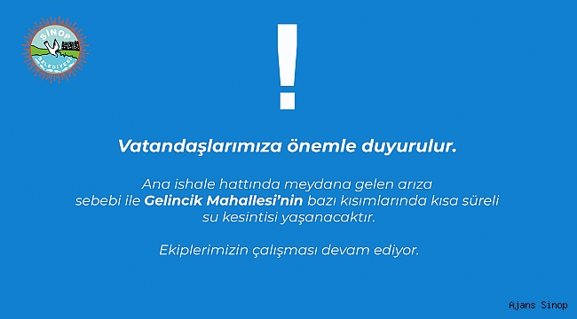 Konu ile ilgili Sinop Belediyesi’nden yapılan açıklamada; “Sinop’ta Ana İshale hattında meydana gelen arıza sebebi ile Gelincik Mahallesi’nin bazı kısımlarında kısa süreli su kesintisi yaşanacaktır. Ekiplerimizin çalışması devam ediyor.” denildi.