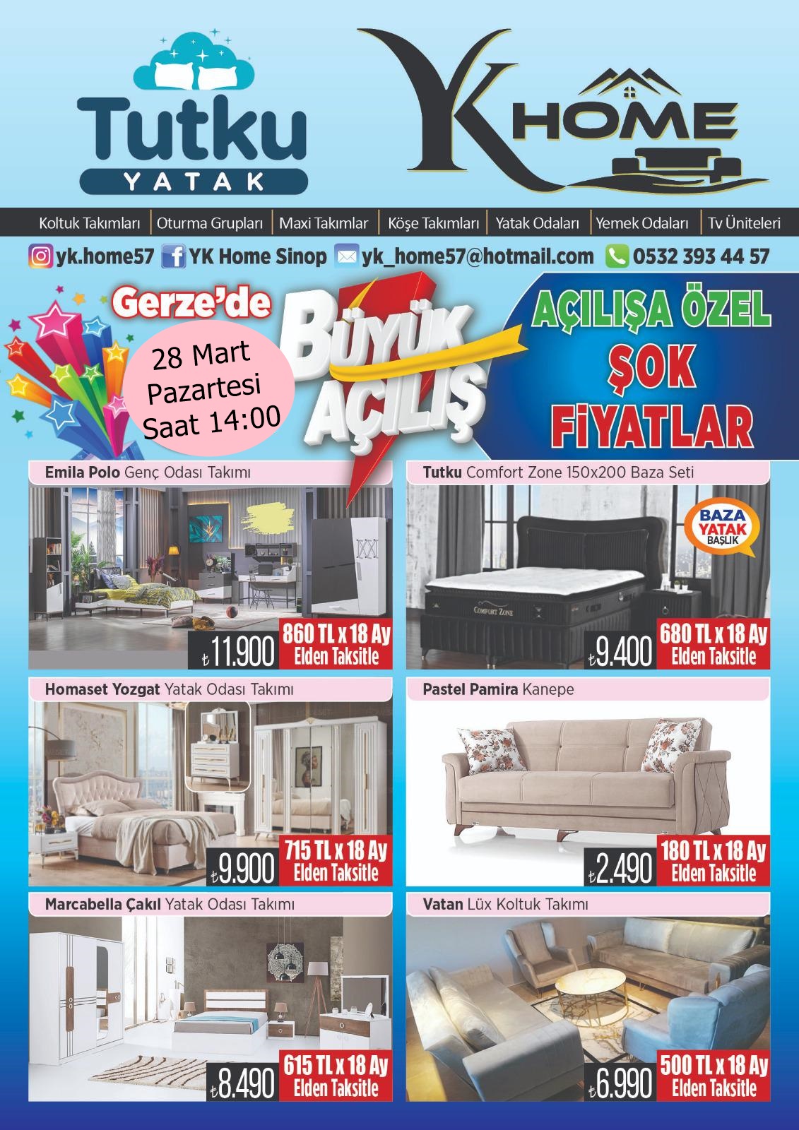 1987 Yılında kurulmuş olan ve müşteri memnuniyetine odaklanan Tutku Yatak, İş İnsanı Yaşar Kara’nın girişimleriyle Gerze’de açılıyor. Yatak, Yatak Setleri, Baza, Oturma Gurupları başta olmak üzere birçok ürünü bünyesinde bulunduran Tutku Yatak, 28 Mart Pazartesi Saat 14:00’da açılıyor. Ajans Sinop’un üstelendiği organizasyonunda açılışa özel kaçırılmaması gereken kampanyalar da yer alacak.