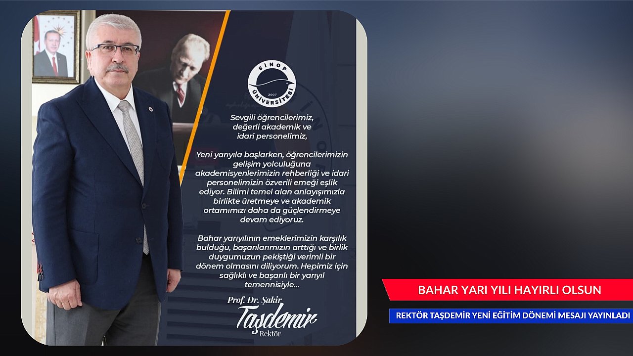 GÜNDEM Yayınlanma: 10 Şubat 2026 - 18:22 REKTÖR TAŞDEMİR YENİ EĞİTİM DÖNEMİ MESAJI YAYINLADI BAHAR YARI YILI HAYIRLI OLSUN GÜNDEM 10 Şubat 2026 - 18:22 Yorumlar Dinle Yazdır A Büyüt A Küçült Yorumlar REKTÖR TAŞDEMİR YENİ EĞİTİM DÖNEMİ MESAJI YAYINLADIBAHAR YARI YILI HAYIRLI OLSUNSinop Üniversitesi Rektörü Prof.Dr. Şakir Taşdemir yayınladığı mesaj ile bugün eğitime başlanan Bahar Yarı Yılının hayırlı olması temennisinde bulundu. # Rektör# Şakir Taşdemir# Ajans Sinop# Barbaros Baltacı# Ertan Aydın# Aydın Group YORUMLAR FACEBOOK adlı kullanıcıya cevap x Gönder İlginizi Çekebilir GERZE FEDERASYONU'NA ÖNEMLİ ZİYARET ERFELEK'TE POLİS HAFTASI KUTLANDI ÇAKAN'LARDAN VALİ ÖZARSLAN'A ZİYARET ZİRAİ DON UYARISI YAPILDI Son Haberler METEHAN BEBEK'E ANLAMLI DESTEK SİNOP ÜNİVERSİTESİ MART AYI FAALİYETLERİ ÇÖP KONTEYNERLERİ KALDIRILDI TEKNE TURLARI ARTIK 250 TL SİNOP ÜNİVERSİTESİ SÜPER LİG'DE KÜÇÜKÇEKMECE SİNOP SPOR'UN ACI GÜNÜ KÜÇÜKÇEKMECE SİNOP SPOR'UN ACI GÜNÜ