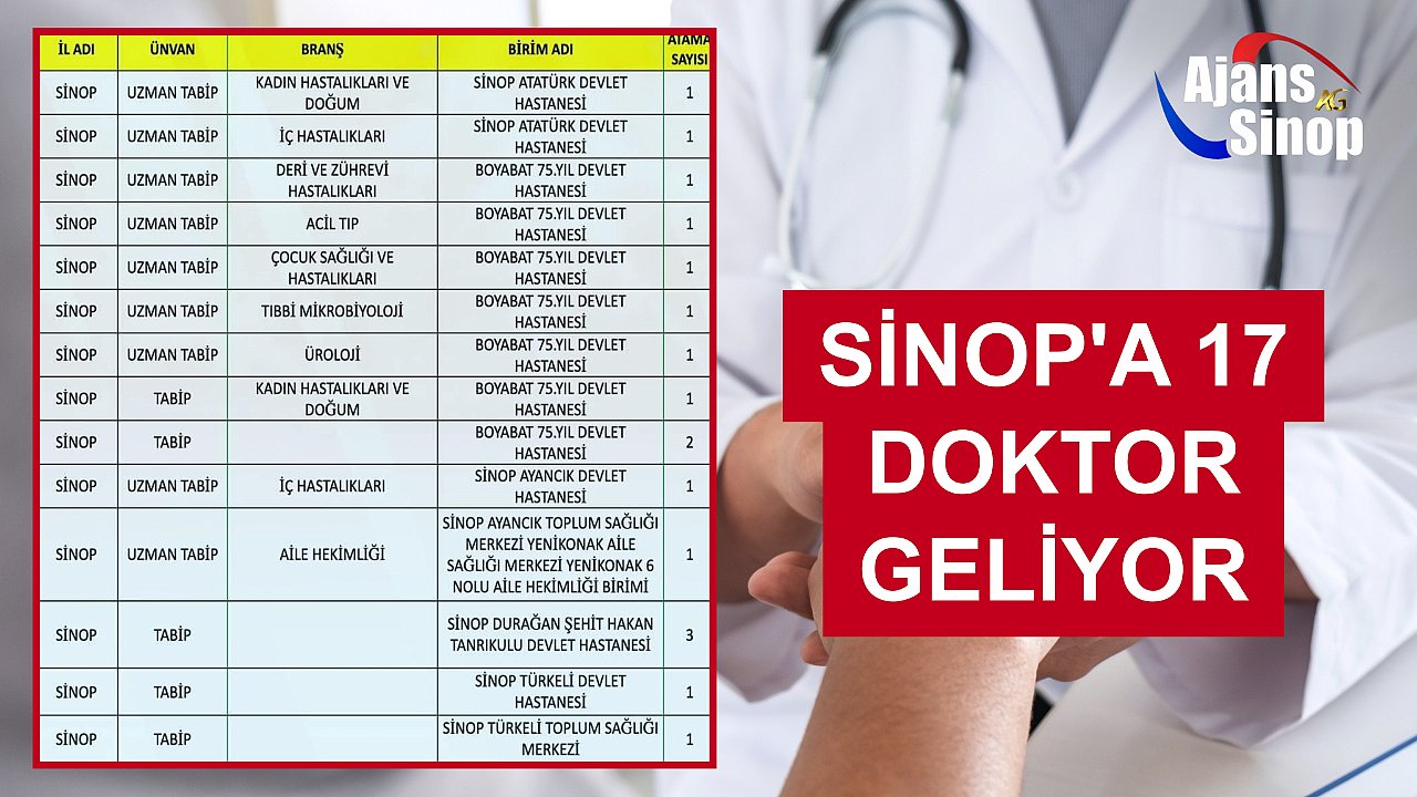 7 doktorun Boyabat'a, 2 doktorun Sinop Merkeze, 2 doktorun Ayancık, 2 Doktorun Türkeli, 1 doktorun Durağan'da görev yapacağı kaydedildi.