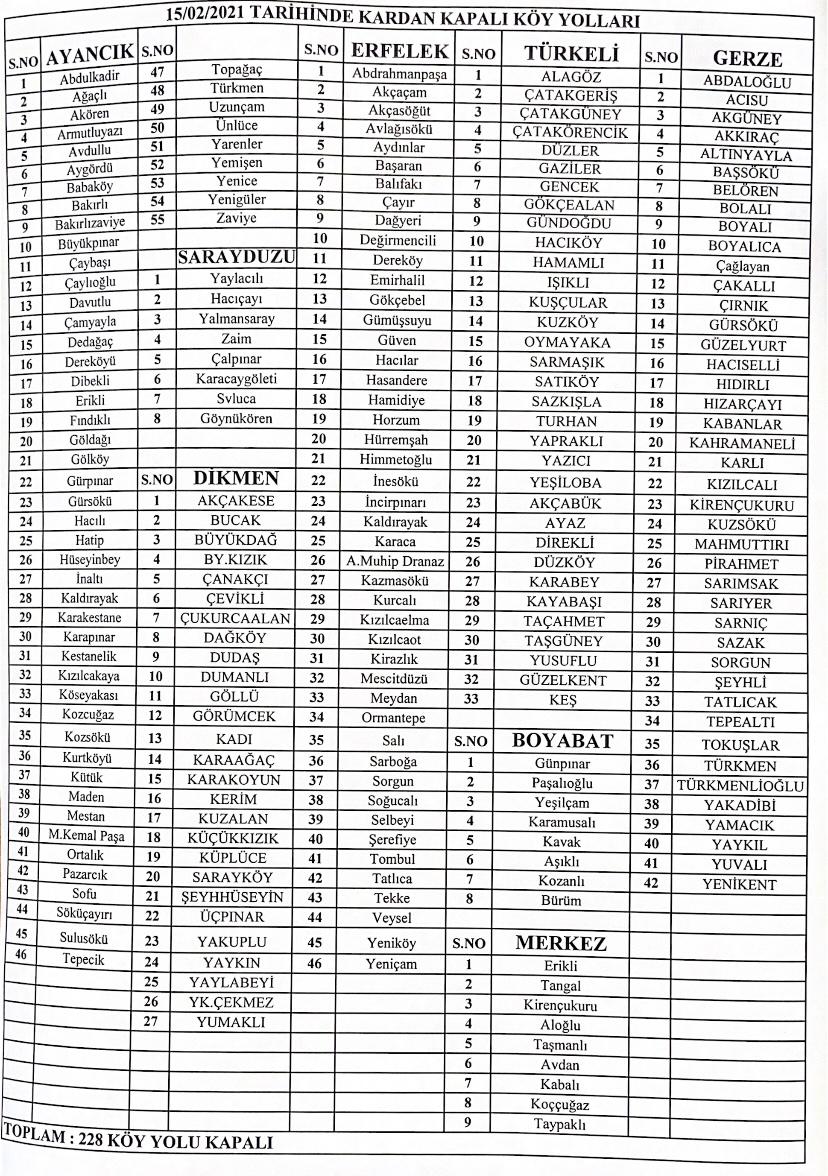 Sinop İl Özel İdaresinden alınan bilgiye göre: Sinop merkezde 9, Ayancık ilçesinde 55, Boyabat'ta 8, Dikmen'de 27, Erfelek'te 46, Gerze'de 42, Saraydüzü'nde 8 ve Türkeli ilçesinde de 33 köyle ulaşım tamamen kapandı.