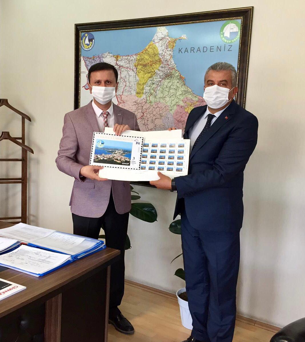 Üzerinde sinop manzarasının bulunduğu posta pulları, PTT Sinop Başmüdürü İbrahim Köklü tarafından Sinop İl Özel İdaresi Genel Sekreteri Yahya Çınkıl’a teslim edildi.