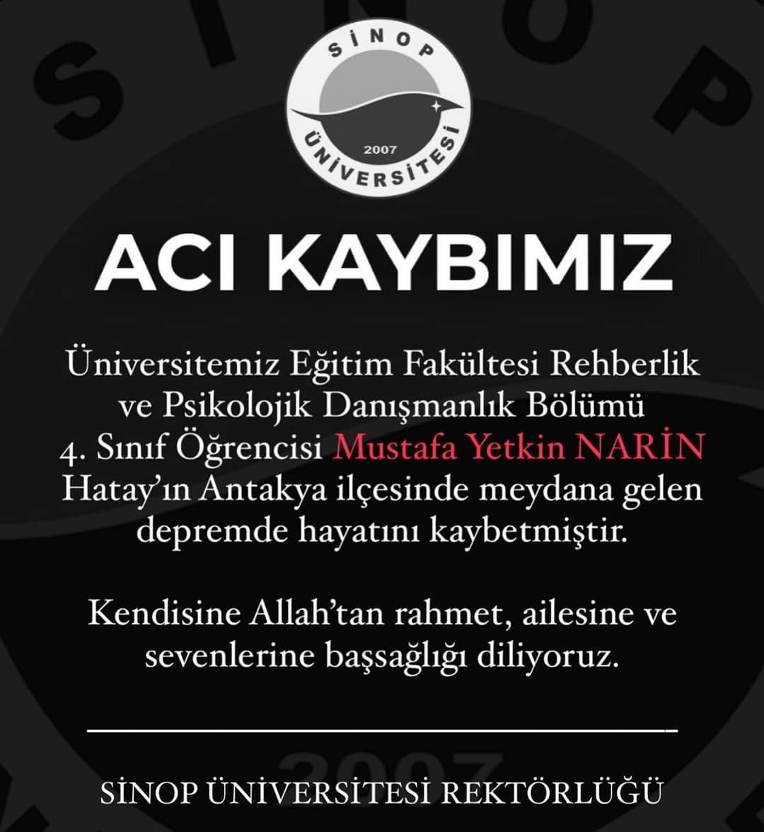 Sinop Üniversitesi Rektörlüğü sosyal medya hesaplarından taziye mesajı yayımlayarak acı haberi duyurdu. Rektörlük mesajında; “Üniversitemiz Eğitim Fakültesi Rehberlik ve Psikolojik Danışmanlık Bölümü 4. Sınıf öğrencisi Mustafa Yetkin Narin, Hatay’ın Antakya ilçesinde meydana gelen depremde hayatını kaybetmiştir. Öğrencimize Allah’tan rahmet, ailesine ve sevenlerine başsağlığı diliyoruz” ifadelerine yer verildi.