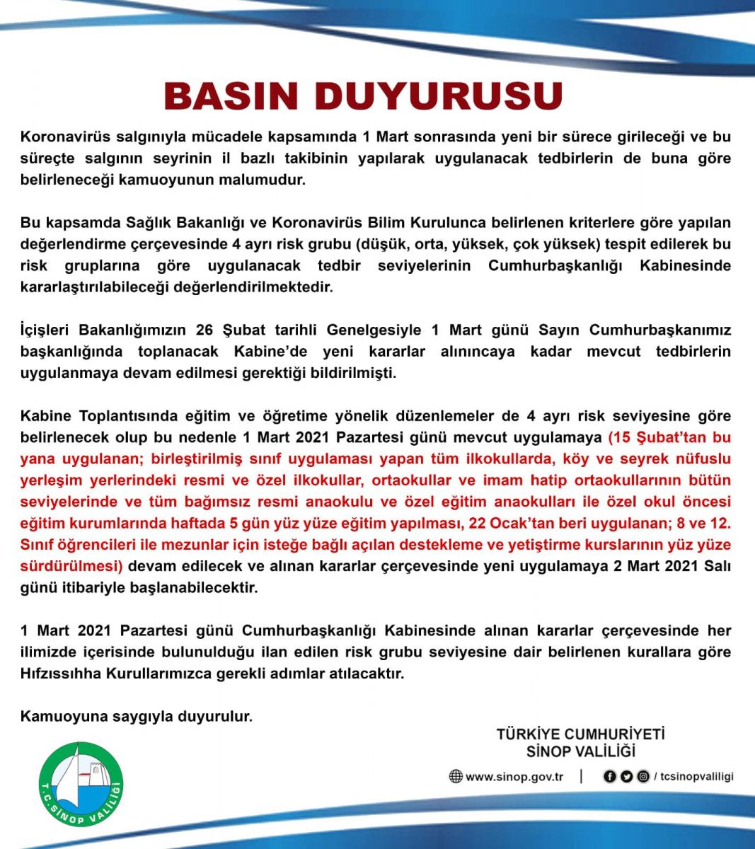 Sinop Valiliği, 1 Mart itibarıyla koronavirüs salgınıyla mücadele kapsamında yeni bir sürece girileceğini ve bu süreçte eğitim öğretim kurumlarında 1 Mart 2021 Pazartesi günü Cumhurbaşkanlığı Kabinesinde alınacak kararlar doğrultusunda yeni adımlar atılacağını belirtti. Toplantının ardından içerisinde bulunulan ve ilan edilen risk grubu seviyesine dair belirlenen kurallara göre Hıfzıssıhha Kurullarınca gerekli adımların atılacağı belirtildi.