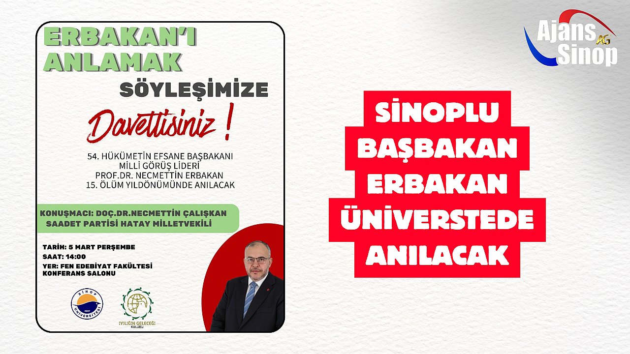 Sinoplu Merhum Başbakan Prof.Dr. Necmettin Erbakan ölüm yıldönümünde Erbakan Haftası etkinlikleri kapsamında Sinop Üniversitesi Fen Edebiyat Fakültesi Konferans Salonunda düzenlenecek söyleşi ile anılacak.