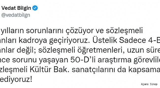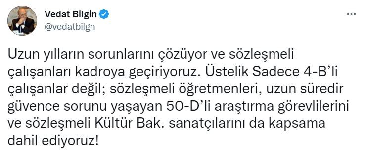 Sosyal medya hesabından açıklamalarda bulunan Bilgin, “Uzun yılların sorunlarını çözüyor ve sözleşmeli çalışanları kadroya geçiriyoruz. Üstelik sadece 4-B’li çalışanlar değil; sözleşmeli öğretmenleri, uzun süredir güvence sorunu yaşayan 50-D’li araştırma görevlilerini ve sözleşmeli kültür ve Turizm Bakanlığı sanatçılarını da çerçeveye dahil ediyoruz” ifadelerini kullandı.