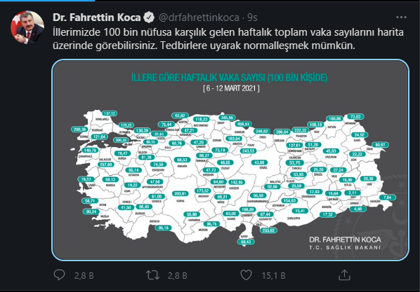Sağlık Bakanı Dr. Fahrettin Koca sosyal medya hesabından şu ifadelere yer verdi; “İllerimizde 100 bin nüfusa karşılık gelen haftalık toplam vaka sayılarını harita üzerinde görebilirsiniz. Tedbirlere uyarak normalleşmek mümkün.” Dedi.