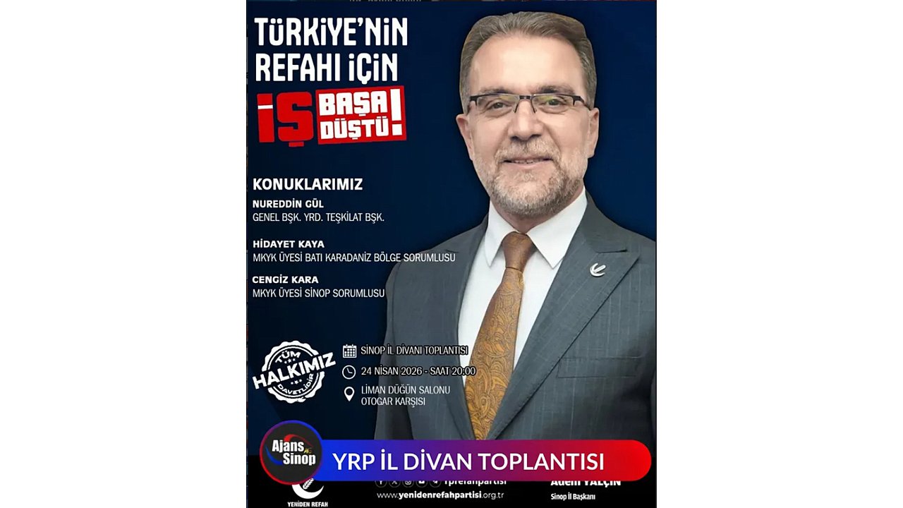 Yeniden Refah Partisi Sinop İl Başkanlığı Sinop İl Divan Toplantısını 24 Nisan 2026 Cuma günü Otogar Karşısı Liman Düğün Salonunda gerçekleştirilecek. Teşkilatlanmadan Sorumlu Genel Başkan Yardımcısı Nurettin Gül'ün katılacağı il Divan toplantısı Cums akşamı Saat 20.00 da yapılacak.